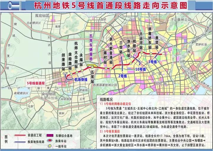 目前杭州地铁规划建设1-14号线,其中5号线是至今杭州地铁线路中单线最长的一条线路,穿越7个城区,设有16个换乘站,串联起余杭、西湖、拱墅、下城、上城、滨江、萧山七城区并连接杭临、杭绍两条城际铁路,是名副其实的“换乘”